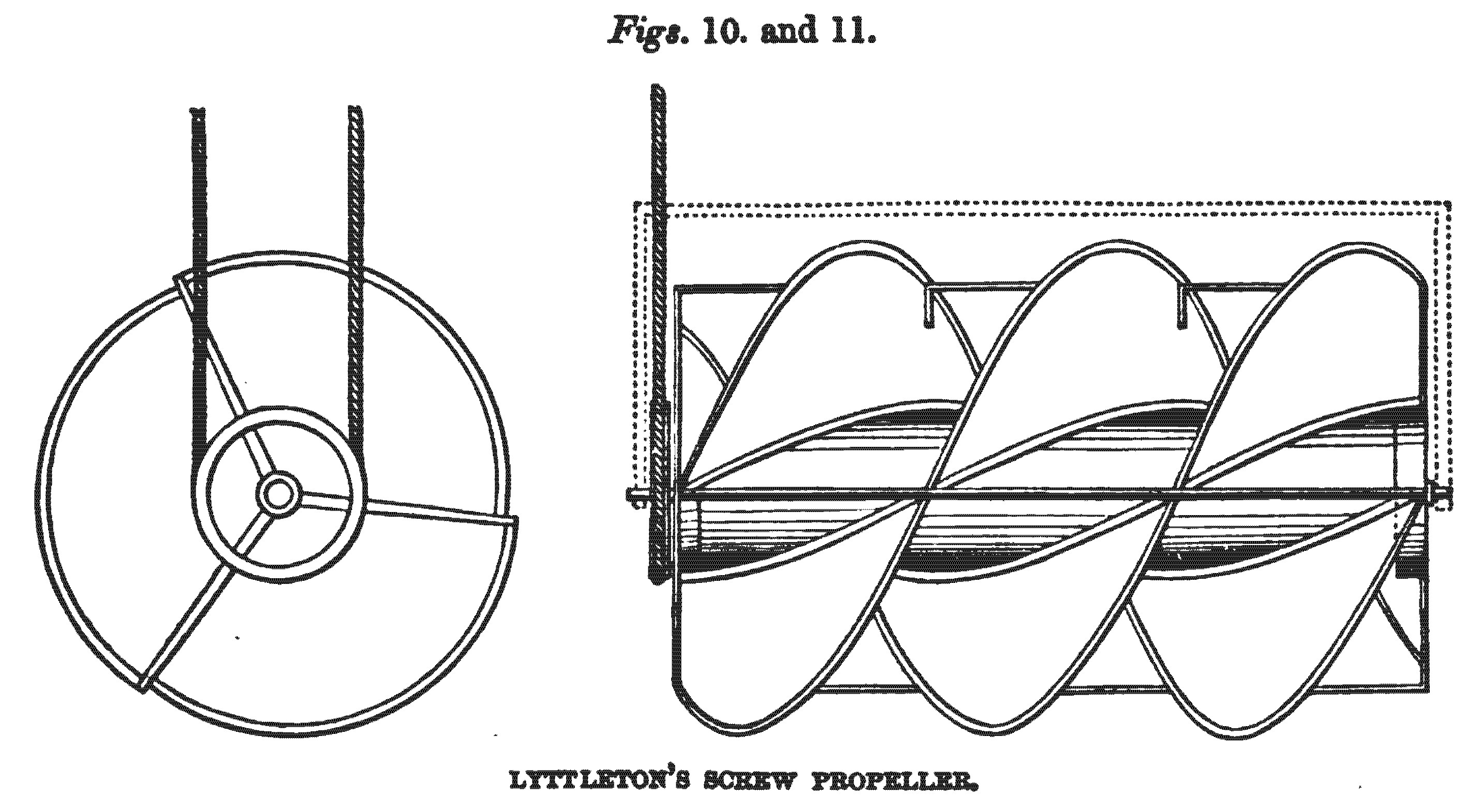 On the 11th November, 1794, William Lyttleton, of Goodman’s Fields, Middlesex, merchant, enrolled a patent for an instrument which he called the “Aquatic Propeller,” by which vessels were to be forced through the water. This propeller consisted of three helical feathers wound on a cylinder, as represented in figs. 10. and 11., and these cylinders were to be so fixed at the bow and stern, or at the sides, as to be immerged [sic] in the water, and to carry the vessel forward when put into revolution. Each cylinder, or screw, was to be turned by an endless rope, working in a sheave. An experiment was made with this screw by Lyttleton, in a boat in the Greenland Dock, and was witnessed by Colonel Beaufoy; but the effect was less than was expected, - the speed realised being only about two miles an hour. The invention was said to have been brought from China, from whence Lyttleton, who was a merchant, may have derived it.